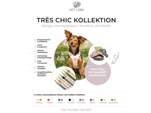 Hey Lana is aimed at sophisticated dog owners for whom safety and functionality combined with style are particularly important. We pursue the goal of bringing joy into the daily life with your beloved four-legged friend with well thought-out and stylish dog accessories. Our philosophy is: By animal lovers for animal lovers, so we put a lot of love and precision into every product.